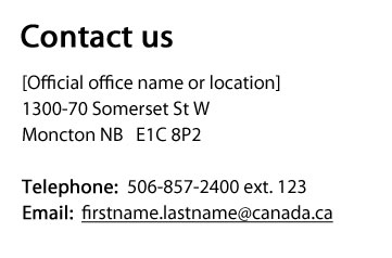 There are 2 patterns for presenting contact information on Canada.ca pages. The contact information pattern is a standardized block that presents the street or mailing address, email address and telephone numbers, while the contact links pattern presents links to contact pages.