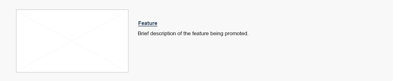 A heading titled “Featured” is followed by one feature placeholder. The image placeholder is on the left side and is surrounded by a light grey background. Within the image placeholder are the prescribed image dimensions: 360px x 203px. To the right of the image placeholder is a placeholder hyperlink that reads [Feature hyperlink text]. Underneath is the following placeholder text: Brief description of the feature being promoted.
