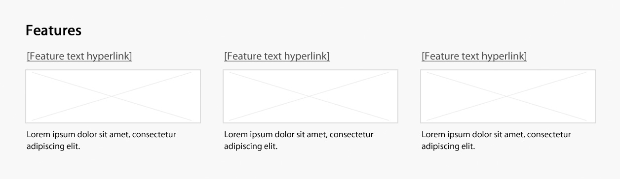 A heading titled “Features” is followed by two feature placeholders in a horizontal row. Each has an image placeholder surrounded by a light grey background. Within the image placeholder are the prescribed image dimensions: 360px x 203px. Below each image placeholder on the grey background is a placeholder hyperlink that reads [Feature hyperlink text]. Underneath is the following placeholder text: Brief description of the feature being promoted.