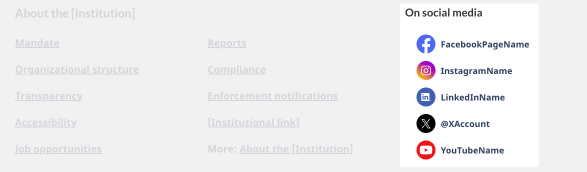 Social media channel links appear in a section with the heading “On social media”. Below the heading is a horizontal list with associated icons, but without labels: