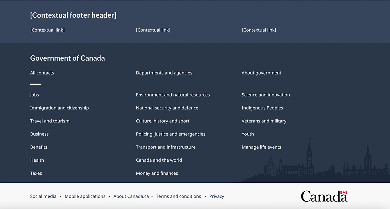 On large screens the global footer includes 3 distinct bands of links. The first is the contextual band. It contains a title and 3 contextual links in a single row. The second is the main band. It’s arranged in 3 columns and contains links to “All contacts,” “Departments and agencies,” and “About government.” There is a small decorative line as a break before continuing with links to all themes and audiences. The sub-footer is at the bottom and contains links to “Social media,” “Mobile applications,” “About Canada.ca,” “Terms and conditions,” and “Privacy.” These are all aligned to the left in a single row. It also includes the Canada wordmark in the same row, aligned to the right.